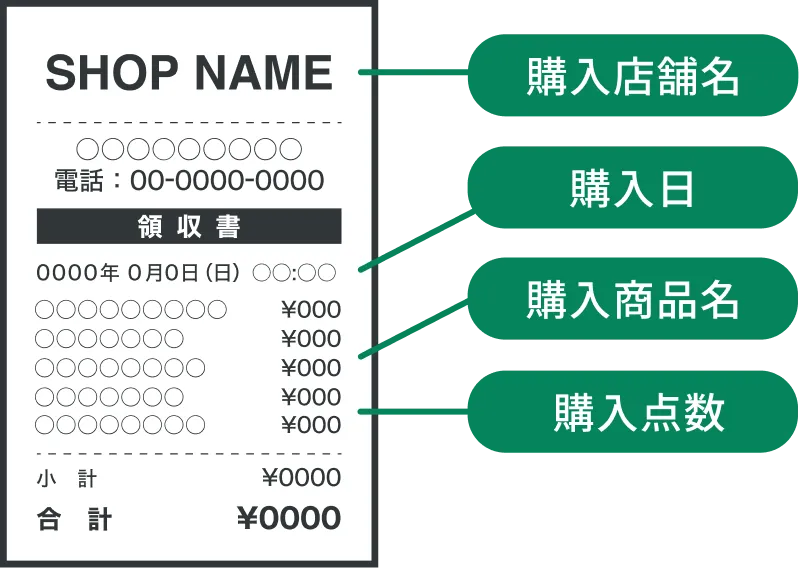 レシートは購入店舗名、購入日、購入商品名、購入点数がはっきり写るようにしてください。
